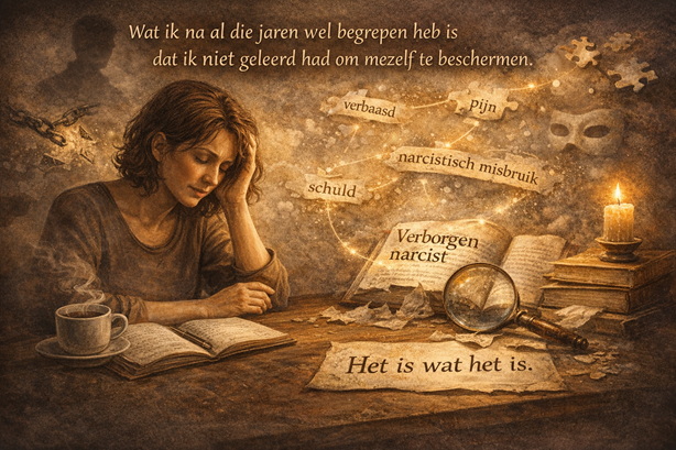 En nu weet ik het, ik heb veel geleerd en mijn ervaring is mijn kennis geworden. En met dat wat ik leerde was ik soms verbijsterd, maar moest die ervaringen en kennis toelaten. Want uiteindelijk klopte het dat hij een verborgen narcist was, ik herkende veel dingen. En ik leerde denken en zeggen: ‘Het is wat het is.’