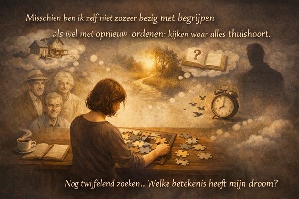 Misschien is het ook wat ik nu aan het doen ben: niet zozeer begrijpen, maar opnieuw ordenen. Kijken waar wat hoort, hoe voel ik me na een droom. Dat is ook iets wat mensen al lang proberen met hun dromen.