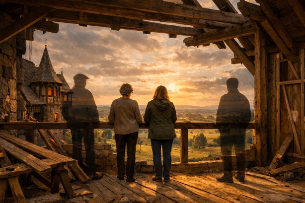 Het gaat zo, ik droom dat ik bij een oom en tante ben en we zijn meegenomen naar een veld waar ze hun nieuwe houten huis aan het bouwen zijn. Eigenlijk een antiek huis en een kasteelachtig iets. We lopen met zijn vieren de trap op want daar is nog niet alles klaar en het uitzicht is geweldig. De tweede verdieping was helemaal leeg, de muur was niet klaar waarbij ik even het gevoel had dat mijn ex me eraf kon duwen, maar wist ook dat hij het niet aandurfde. Het dak en enkele muren zijn nog niet helemaal af waardoor we naar de verre weilanden kunnen kijken.