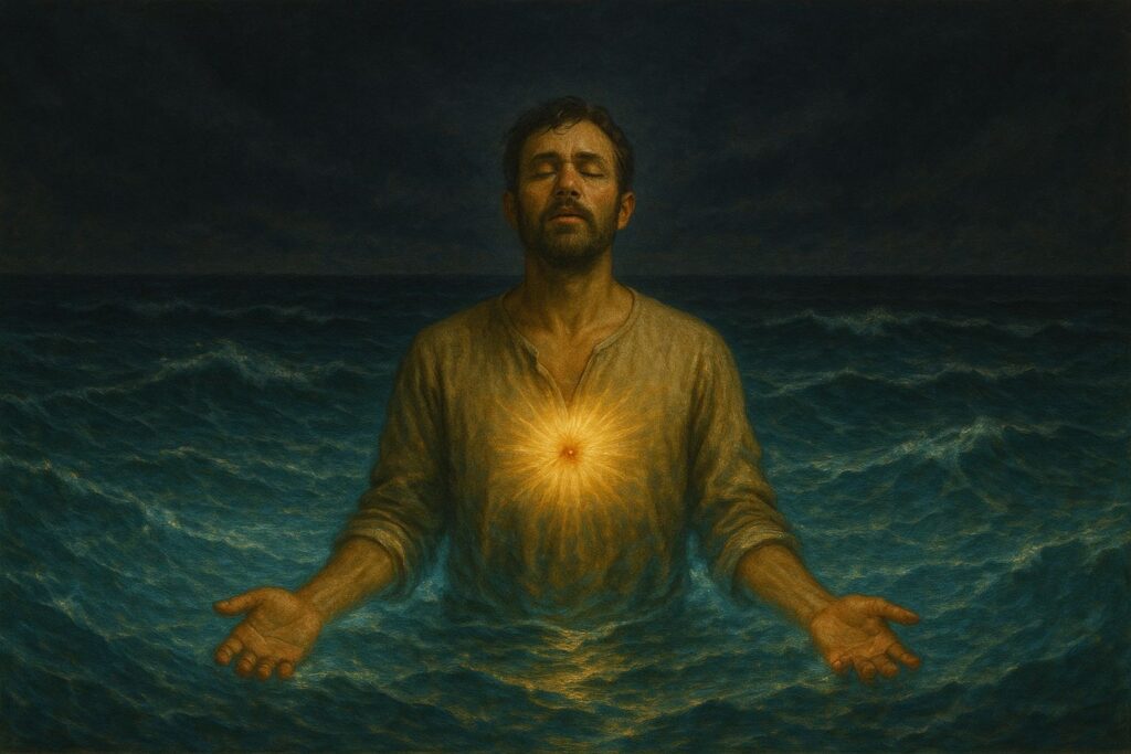 Hij stapt de oceaan in, in de verwachting te verdrinken, maar in plaats daarvan drijft hij, niet gedragen door angst, maar door licht. Hij wordt wakker en huilt, wetende dat juist datgene waar hij bang voor was, verdrinking, nu juist datgene is geworden wat hem heeft gedragen. Dit is de essentie van je transformatie.