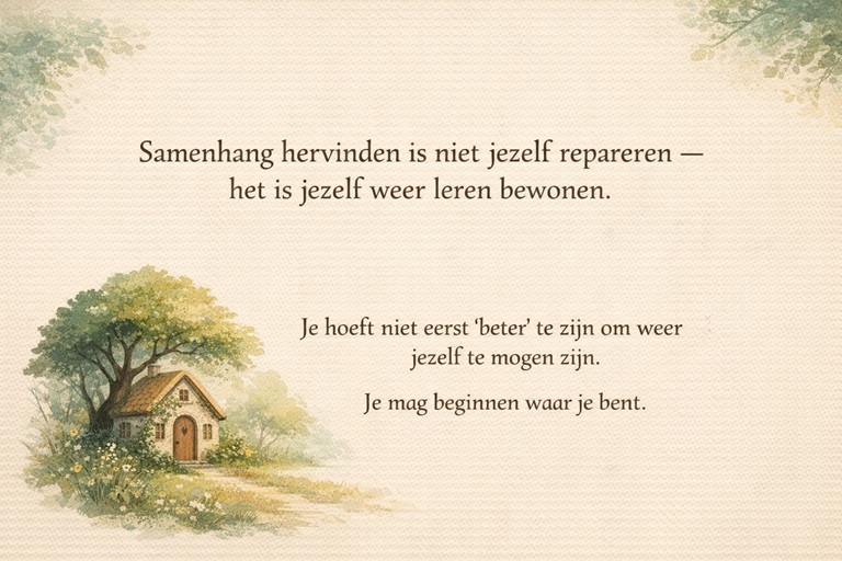 Samenhang hervinden is niet jezelf repareren — het is jezelf weer leren bewonen.